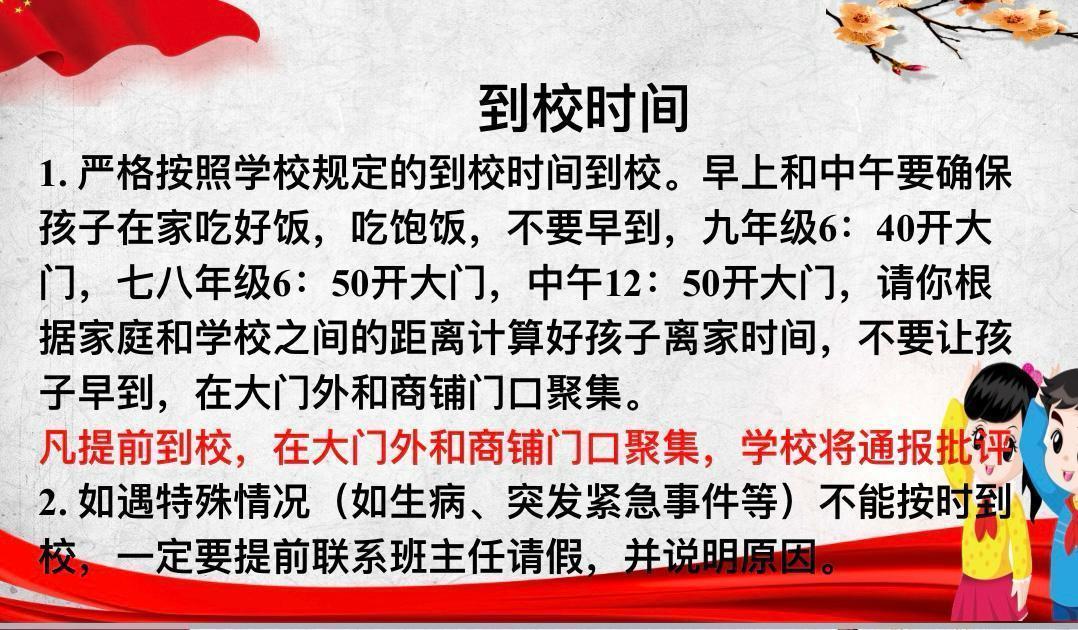 | “请你根据家庭和学校之间的距离计算好孩子离家时间,不要让孩子早到,在大门外和商铺门口聚集……”新学期开学在即,河南西峡县城区一初中的学生家长刘女士(化姓)收到学校下发的一份到校须知,其中明确规定了学生到校时间。让刘女士略感无奈的是,这份到校须知中用红色字注明“凡提前到校,在大门外和商铺门口聚集,学校将通报批评”。  西峡县是河南省南阳市下辖县,根据南阳市教育局发布的2025年普通中小学校寒假时间表,全市义务教育阶段学校的新学期从2月14日正式上课。 刘女士向潇湘晨报表示,她的孩子在西峡县城区一初中读初一,日前她在班级家长群收到了开学到校须知,第一条就提到要“严格按照学校规定的到校时间到校”,其中明确“九年级6:40开大门,七八年级6:50开大门,中午12:50开大门”。此外,须知还用一行红字告知家长和学生:“凡提前到校,在大门外和商铺门口聚集,学校将通报批评。” 对于学校的这份到校时间表,刘女士并不陌生:“上学期就是如此,孩子总是小心翼翼遵守,生怕出一点错就被通报批评,但私下跟我说过很反感这种过于严格的管理。” 此外,还让刘女士和其他家长觉得“不舒服”的是,这份到校须知对学生的发型进行了规范要求,其中罗列了一些男/女生不良发型,这些发型的名字包括“渣男锡纸烫”“没钱理发流浪型”“成年妇女衰老型”等名字。刘女士表示:“虽然我不会让自己孩子留这样的发型,但这些发型的名称实在不好听,担心会在孩子心里造成潜移默化的影响。”  另一位家长王先生(化姓)的孩子在这所学校就读八年级,他坦言相关细则并不是学校突然通知的:“之前学校就多次通知过不让孩子早到,早到可能会被通报批评。听孩子说是因为学校不允许在校门附近的食品店购买食品,包括早饭。” 2月13日,潇湘晨报记者致电西峡县教育局,一位自称姓王的工作人员回应,学校不让学生提前到校,应该是受到近来全国多地学校周边安全事故的警示,防止学校聚集在校门外出现非正常伤亡事故,从而要求学生随到随进。这位工作人员说:“(学校)不是不让学生提前去,而是怕有些学生去得过早,会让学校和家长学生解释清楚,在管理时更加人性化。” 对于男/女生不良发型名称,该工作人员说:“这些名字我也是第一次听到,应该是理发店或社会上流传的。学校的本意是让学生规范日常行为,不穿齐装异服,不留奇异发型 。会让学校今后下发通知时语言要更规范些。” 潇湘晨报记者李楠 梅玫 举报/反馈